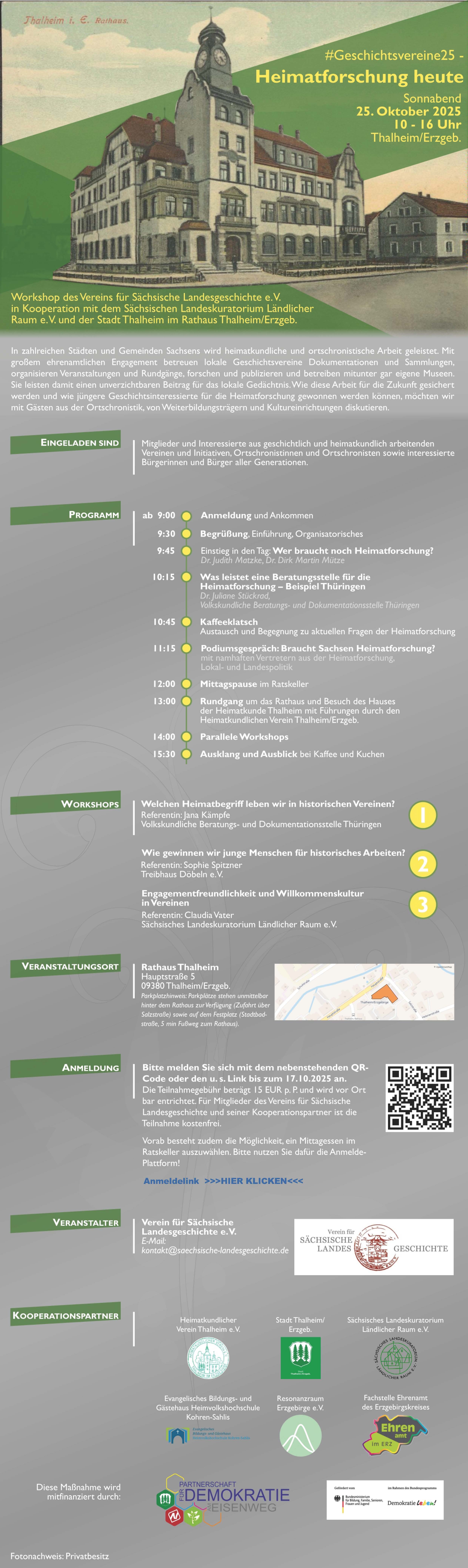Wir laden Sie deshalb sehr herzlich am 25. Oktober 2025 nach Thalheim/Erzgeb. zu unserem diesjährigen Workshop „#Geschichtsvereine25 – Heimatforschung heute“ ein. Seien Sie neugierig auf Impulsvorträge, ein Podiumsgespräch, Praxis-Workshops, die Präsentation der lokalen heimatkundlichen Arbeit und Zeit für Vernetzung und Austausch.